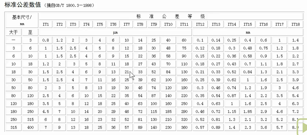 标准公差:可以简单理解,虽然我们知道了公差的概念,但是当我们描述的一个零件的尺寸精度或者一台加工设备的加工精度时,依旧没有一个系统规范的描述原则。十个人可能有十种描述结论,所以为了标准化。国家制定了一个标准,即标准公差系列。下表没截全,国家标准中按照公差值从小到大规定了20个等级。下表中只列出了18个等级,标准公差的等级IT01和IT10在工业中很少,故在上表中没有列出。如需要可在GB/T 1800.1-2009中查到。
